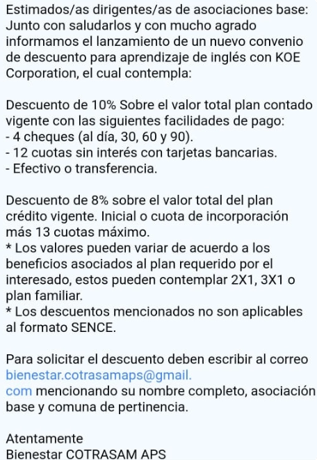 Estimados/as dirigentes/as de asociaciones base: Junto con saludarlos y con mucho agrado informamos el lanzamiento de un nuevo convenio de descuento para aprendizaje de inglés.